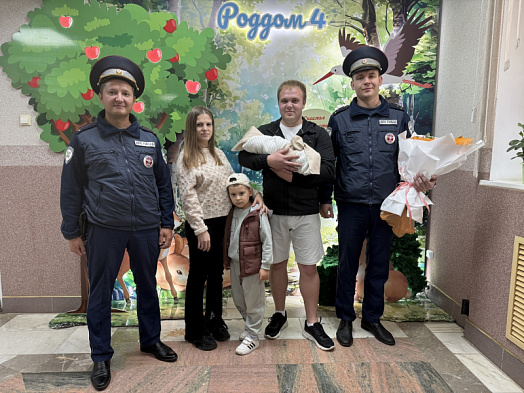 В день выписки сотрудники ДПС приехали в родильный дом и поздравили молодых родителей с рождением сына. Полицейские пожелали семье крепкого здоровья и вручили маме малыша букет цветов.