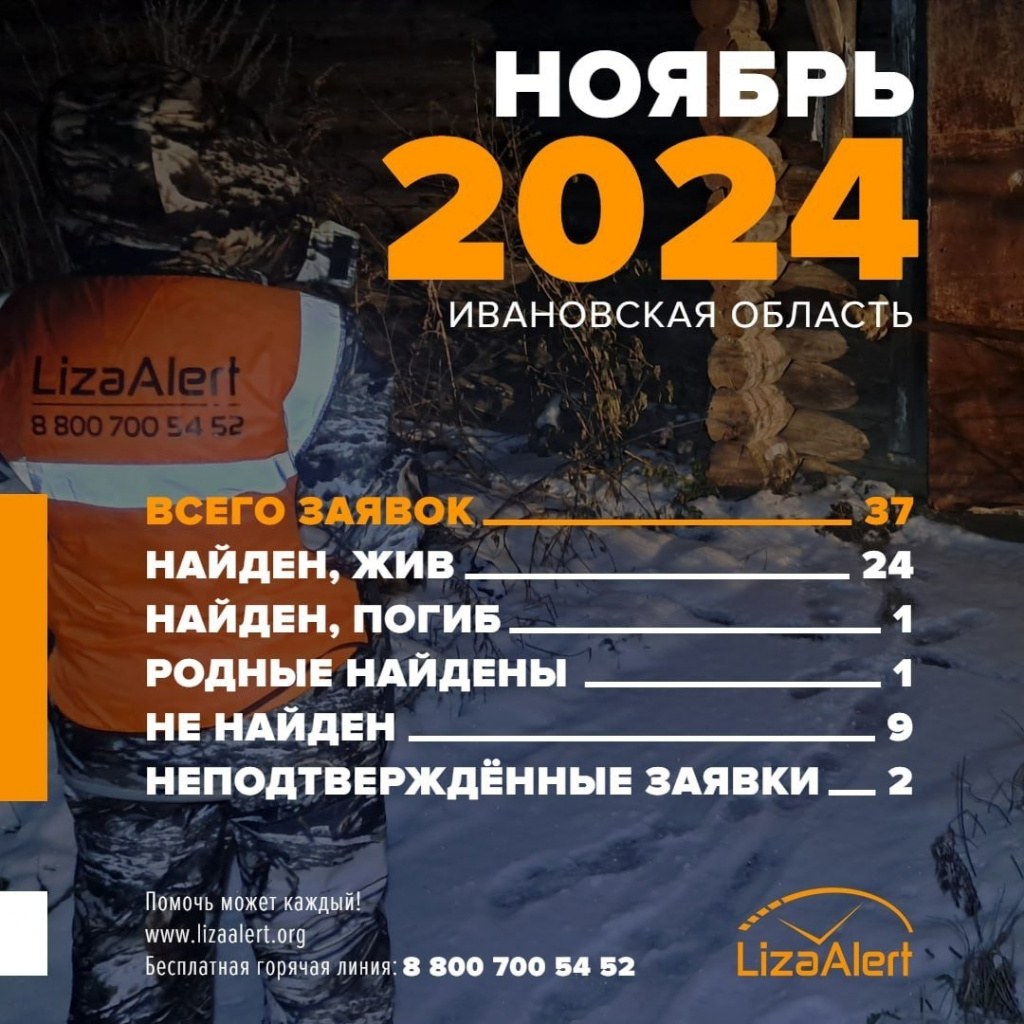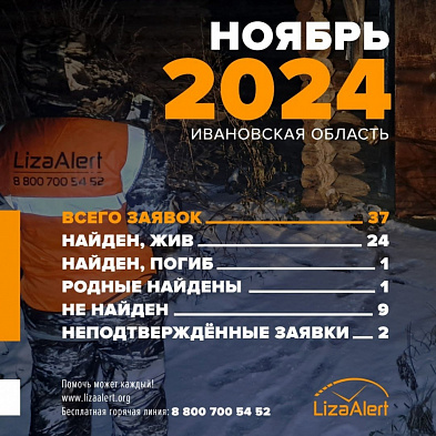 Всего в ивановский ПО «ЛизаАлерт» в минувшем ноябре поступило 37 заявок. 24 поиска завершены со счастливым завершением «Найден! Жив». 9 потеряшек пока не найдены. Для одного человека помощь пришла слишком поздно – погиб. По 1 поиску найдены родственники человека. 2 заявки не получили статус подтверждения.