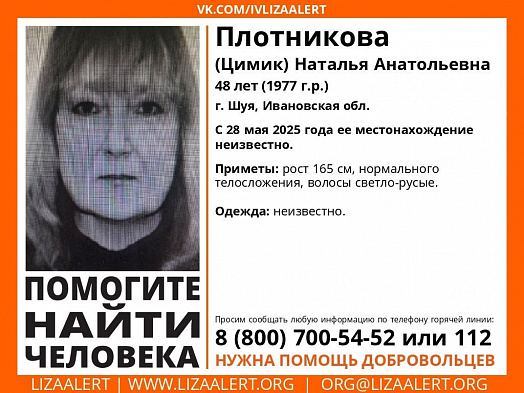 Помогите найти пропавшую 48-летнюю жительницу Шуи Наталью Анатольевну Плотникову. Где может находиться женщина, не известно с 28 мая.