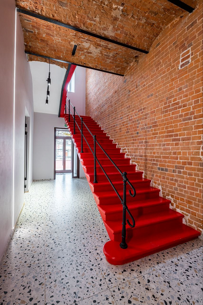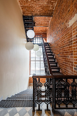 - интегрированы в интерьеры подлинные детали: кирпичные стены с клинчатыми перемычками, сводчатые перекрытия, метлахская плитка, чугунные лестницы и исторические двери.