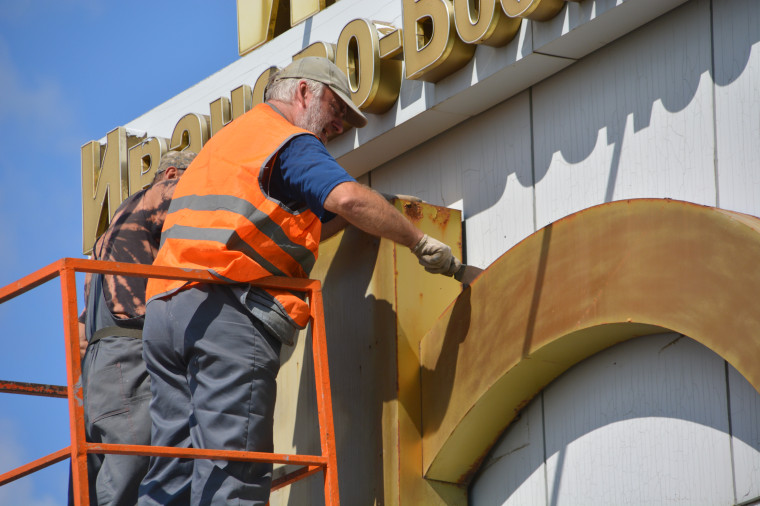 «Ремонт идет третий день. Работники подрядной организации привели в порядок листы облицовки, выкрасили нижнюю часть стелы серой краской. Работы на высоте выполняются с помощью автовышки», - рассказывают в мэрии Иванова.