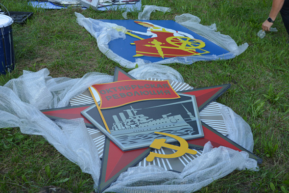 Сегодня, 6 августа, проводились работы по снятию налета и удалению коррозии с декоративных элементов конструкции. После очищения элементы покрасили золотистой акриловой эмалью. Также на стеле планируется закрепить новый герб город и макет ордена. После чего завершат покраску объекта.