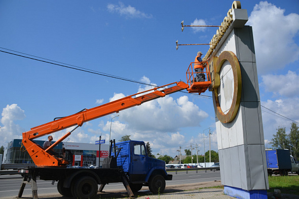 Подрядная организация управления благоустройства Администрации города завершает косметический ремонт стелы на въезде в Иваново со страны столицы.