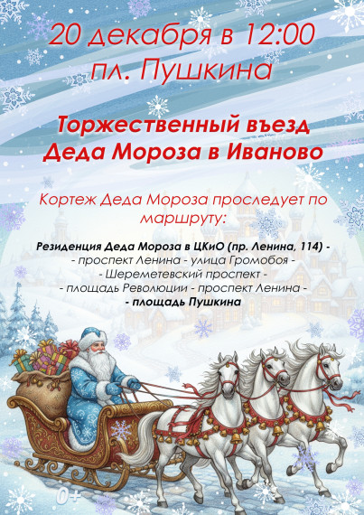 В полдень праздничный кортеж Деда Мороза от его новогодней резиденции в Центре культуры и отдыха без остановок проследует по проспекту Ленина через улицу Громобоя, по Шереметевскому проспекту, мимо площади Революции к площади Пушкина. Здесь сказочные персонажи встретятся с ивановской детворой.