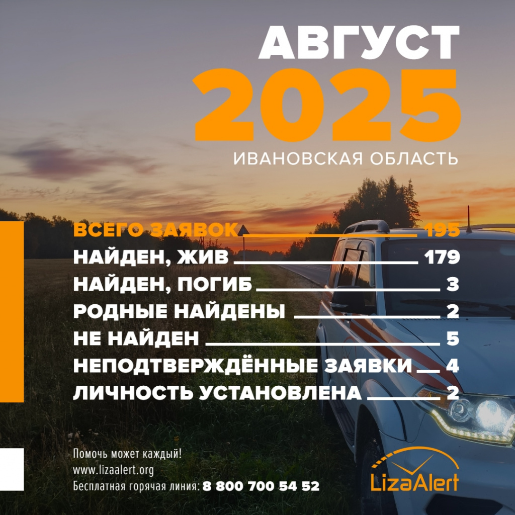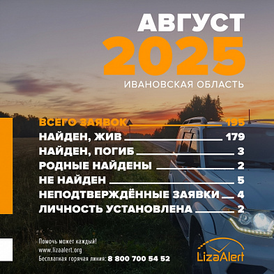 «Год от года, месяц от месяца неизменно одно: люди продолжают теряться, мы продолжаем искать. Все мы ждём того дня, когда на горячую линию больше не поступит ни единого вызова. Когда наконец люди перестанут исчезать. Но, увы, пока он не настал. Этот август стал тому доказательством. За этот бархатный месяц в отряд поступило 195 заявок», - сообщают в ПО «ЛизаАлерт» Ивановской области.