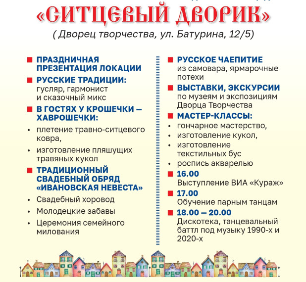 В День города. 9 августа, в 14:30 состоится презентация культурно-туристического пространства «Ситцевый дворик» в Ивановском городском Дворце детского и юношеского творчества (ул. Батурина, 12/5).