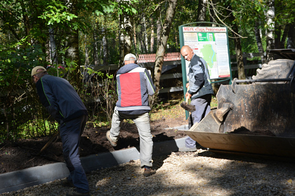 Работы на центральной аллее в парке имени Революции 1905 года стартовали на прошлой неделе – в рамках третьего этапа подрядчик демонтирует старый бордюр и устанавливает новый бордюрный камень, осуществляет укладку асфальта.