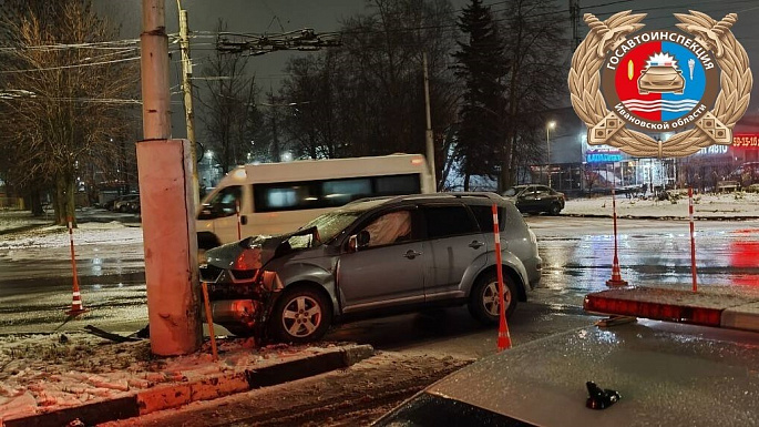 В городе Иваново, в 03:10, на перекрестке проспекта Строителей и улицы Лежневская (без светофора), водитель "Митсубиси Аутлендер" 38 лет потерял контроль над управлением, что привело к столкновению со столбом. Травмы получила 48-летняя пассажирка "Митсубиси", которую госпитализировали с повреждениями головы и тела. Начато административное расследование по статье 12.24 КоАП РФ (нарушение ПДД, повлекшее легкий/средний вред здоровью). Водитель привлечен к ответственности по статьям 12.5 ч.1, 12.27 ч.1 и 12.26 ч.1 КоАП РФ.