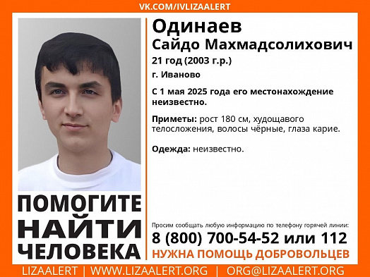 Пропал Одинаев Сайдо Махмадсолихович, 21 год, г. Иваново. С 1 мая 2025 года его местонахождение неизвестно. Приметы: рост – 180 см, худощавого телосложения, волосы черные, глаза карие. Был одет: неизвестно.